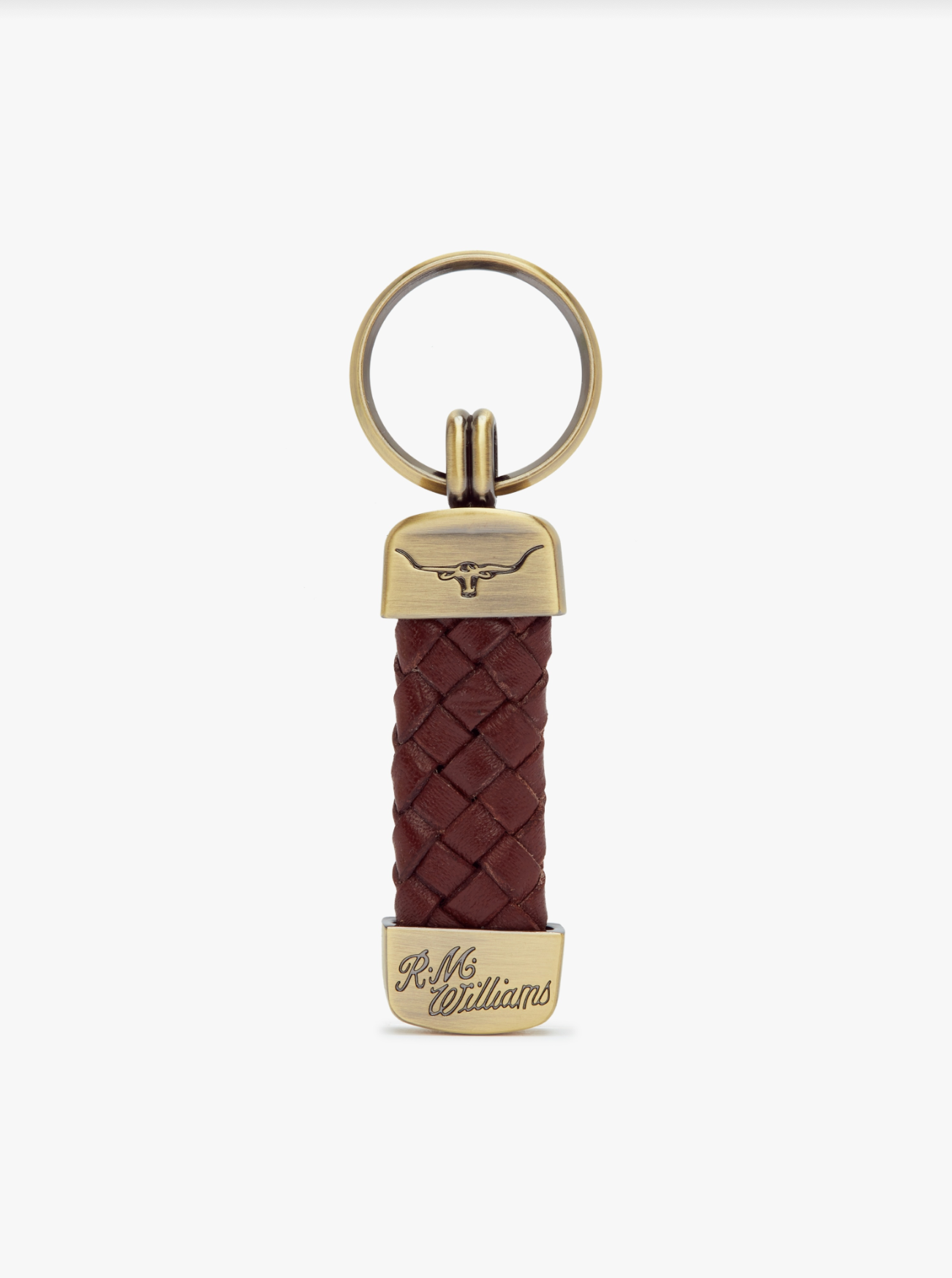 Crafted from plaited kangaroo leather, this key ring includes brass toned fittings with R.M.Williams and Longhorn embossing. Made in Australia
